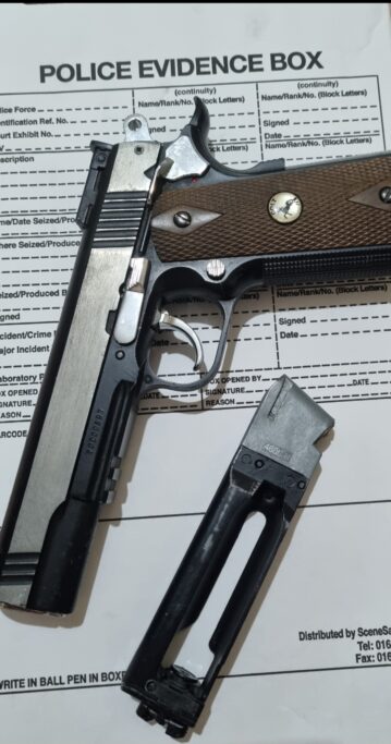 “Whilst this was happening 2 males and 2 females emerged from a nearby street with one of the males matching the description of the male with the gun, we immediately took action to stop and detain the 2 males who were compliant and gave an account of what the gun was and where in the house it was.”